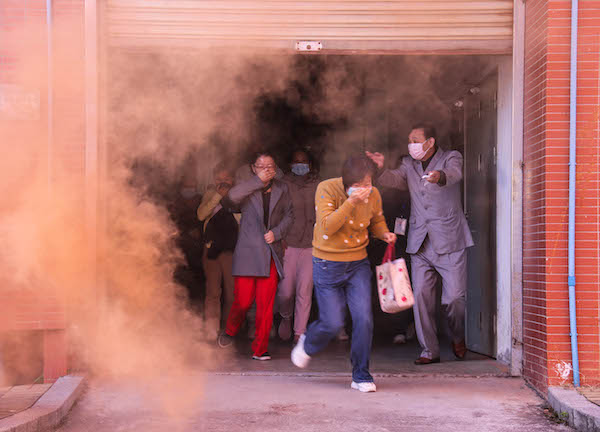 现场师生们进行了火灾的疏散逃生演练。老师和同学们按要求用衣袖、毛巾、湿纸巾捂住口鼻,按照规划好的逃生路线,弯腰快速前行,迅速有序地撤离到了安全地带。