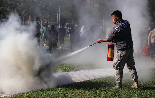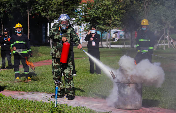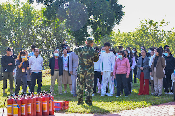 “一提、二拔、三握、四瞄、五压、六射”,在消防队员的指导下,上前进行实地灭火操作的师生们,成功将燃烧的火盆熄灭。