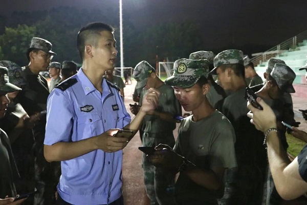 由广州市公安局增城区分局反诈中心的工作人员对军训教官进行国家反诈APP下载安装及操作流程的现场教学,然后教官再给新生们讲解国家反诈APP下载安装及操作流程。