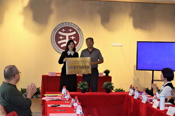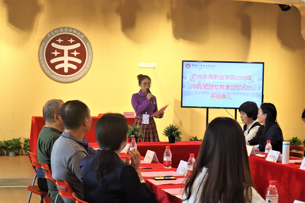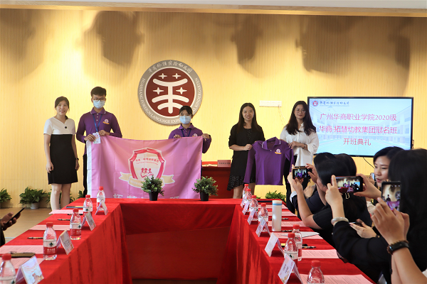 华商•拓慧幼教集团常务副总经理黄楚安女士代表华商•拓慧幼教集团向2020级学前教育专业华商·拓慧幼教冠名班的校内班主任王梦杰、校外班主任陈嘉敏、班长许惠琪以及学习委员陈奕奇分别授予了班服与班旗。