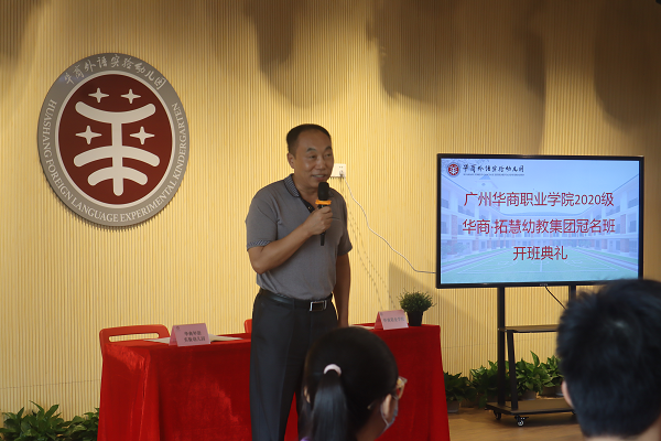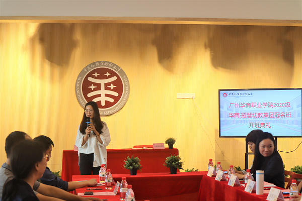 授旗仪式后,华商•拓慧幼教集团总园长兼天悦拓慧(国际)幼儿园、华商外语实验幼儿园行政园长杨秀娜女士致辞。她强调这是两家单位合作的第一步,同时也是日后长远深度合作的开始。她勉励华商·拓慧幼教冠名班学员在此平台上用心学习,努力展现自我。