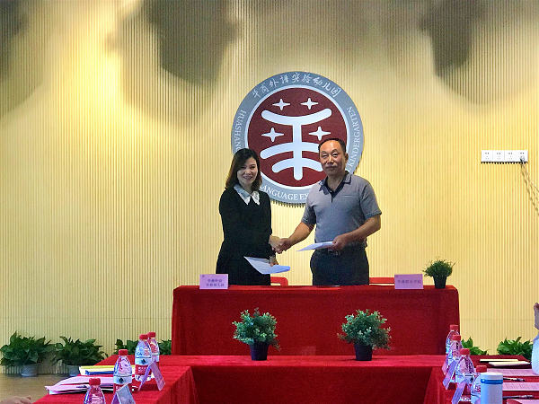 刘玉东副校长与杨秀娜总园长正在签订协议