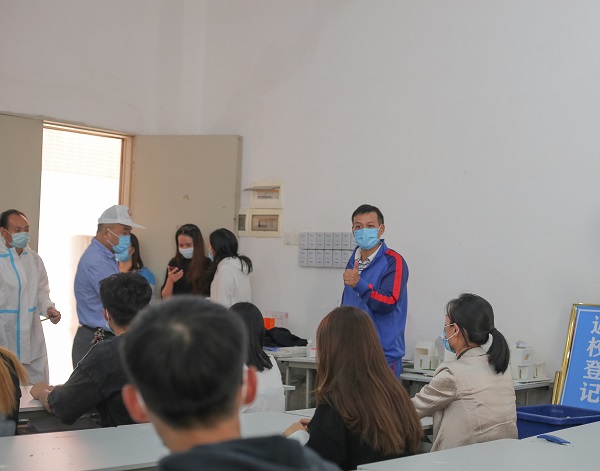 此次演练由学工部部长倪亚丽策划,学生处副处长李平指挥,各职能部门及二级学院相关人员协同开展,进行了包括校门健康监测、课堂出现发热状况、宿舍突发疑似病例、食堂防疫举措介绍等四个情景的模拟演练。