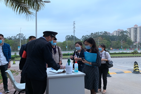 检查组人员在校园门口接受体温检测并进行来访登记。