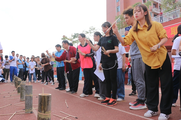 在个人项目结束后,团体项目接过接力棒,再次点燃了现场的活跃气氛。各支代表队根据比赛规则,分别派出一定数量的男女教师组队出战,围绕“共击同心鼓”、“摸石过河”、“珠行万里”、“背部传情”与“仙人指路”五个游戏项目展开一轮又一轮紧张有趣的团队大比拼。大家纷纷表示一起玩得很开心,游戏项目也设计得很有趣。