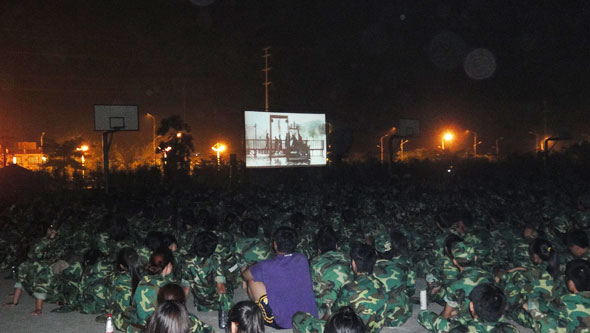 为了丰富军训生活,9月14日晚,我院在篮球场组织参加军训的新生观看了军事题材影片《冲出亚马逊》,整个篮球场上端端正正地坐满了新生,甚至场边的草坡上都是迷彩服的身影。