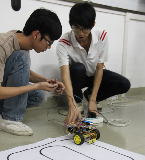 大赛现场各组选手胸有成竹,沉着应对,通过原理讲解与实物演示将一个个完美的作品展现在评委的面前。选手们的精彩表现令现场气氛高潮迭起。有同学表示:“希望以后多举办类似的比赛,在增强动手能力的同时也丰富了校园生活” 。本次大赛评出一等奖1名,二等奖2名,三等奖3名,优胜奖5名。余斌、庞皓元、叶俊强小组荣获一等奖。