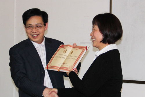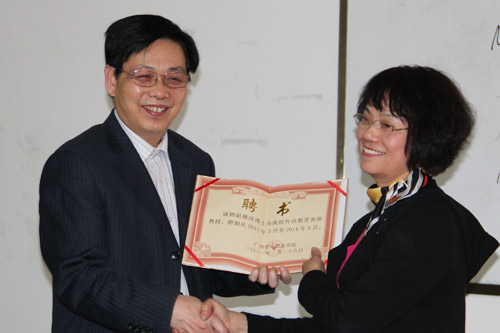 讲座结束时,院党委黄桂标书记代表学院给两位女杰颁发了文学客座教授和英语教育客座教授聘书。