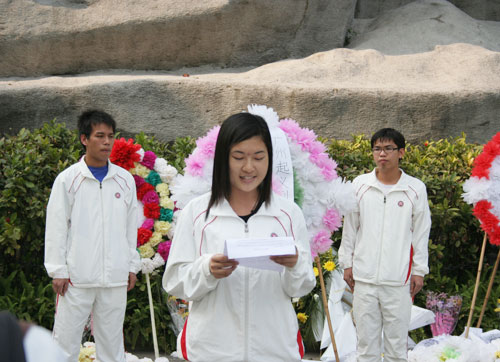 拜祭仪式开始后,黄桂标书记和学生代表向广州起义革命烈士纪念碑敬献花圈,并带领全体师生三鞠躬致敬。在肃穆的气氛中,师生们全体肃立,默哀一分钟,寄托着对革命先烈们的无限崇敬和绻绻思念之情。在郭书记领誓下,全体师生重温了入团誓词。