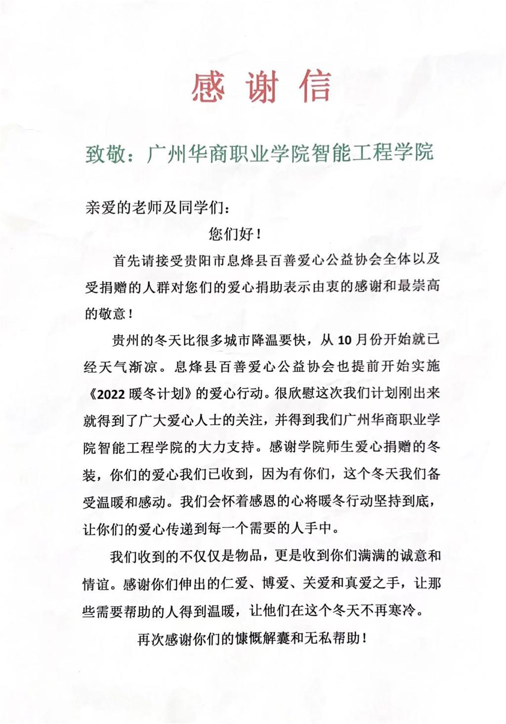 据悉,2022年11月24日,智能工程学院与好人中国雷锋驿站·广东总站、息烽百善爱心公益协会合作开展2022年“暖冬行动·爱心传递”旧衣回收捐赠公益活动,为贵州省青山苗族乡、鹿窝镇湖广村、九庄镇白茂村幼儿园、九庄镇下环山的那些条件艰苦的学生和家庭送去温暖和关爱。活动当天,3000余名学子积极响应,纷纷伸出援助之手,踊跃参与到此次“暖冬行动·爱心传递”公益活动中来。经过一天的募捐,共收到各类衣物近万件,所有的衣物都达到整洁干净、无破损的标准。