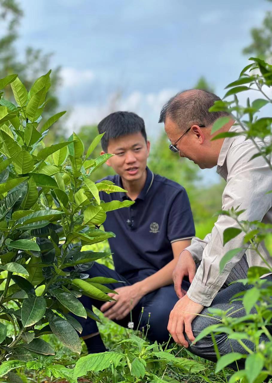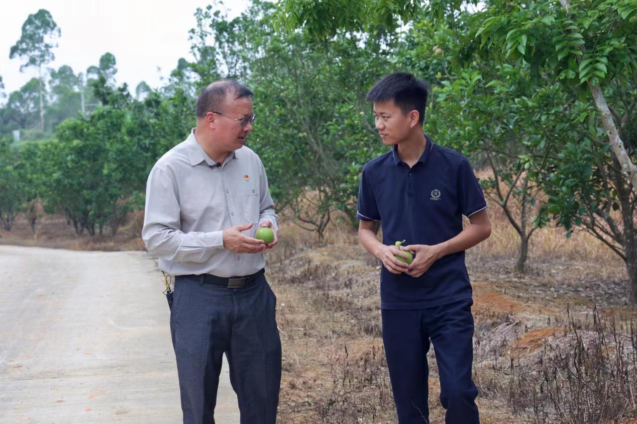 随后,一行人来到合作社种植基地和挂果基地,廖志略热情地介绍化橘红的种植情况。他介绍说,合作社以“公司+合作社+农户”的模式,投入大量资金在种植基地,还与当地果农建立购销合作关系,每年收购化橘红鲜果,解决果农销果难的问题。一路上,翁礼成与廖志略进行深入交谈,谈到企业发展、工作想法及困难等。翁礼成表示,学校高度重视校友工作,将进一步整合资源,根据校友的实际需求,有针对性地提供支持和服务,助力校友事业发展。