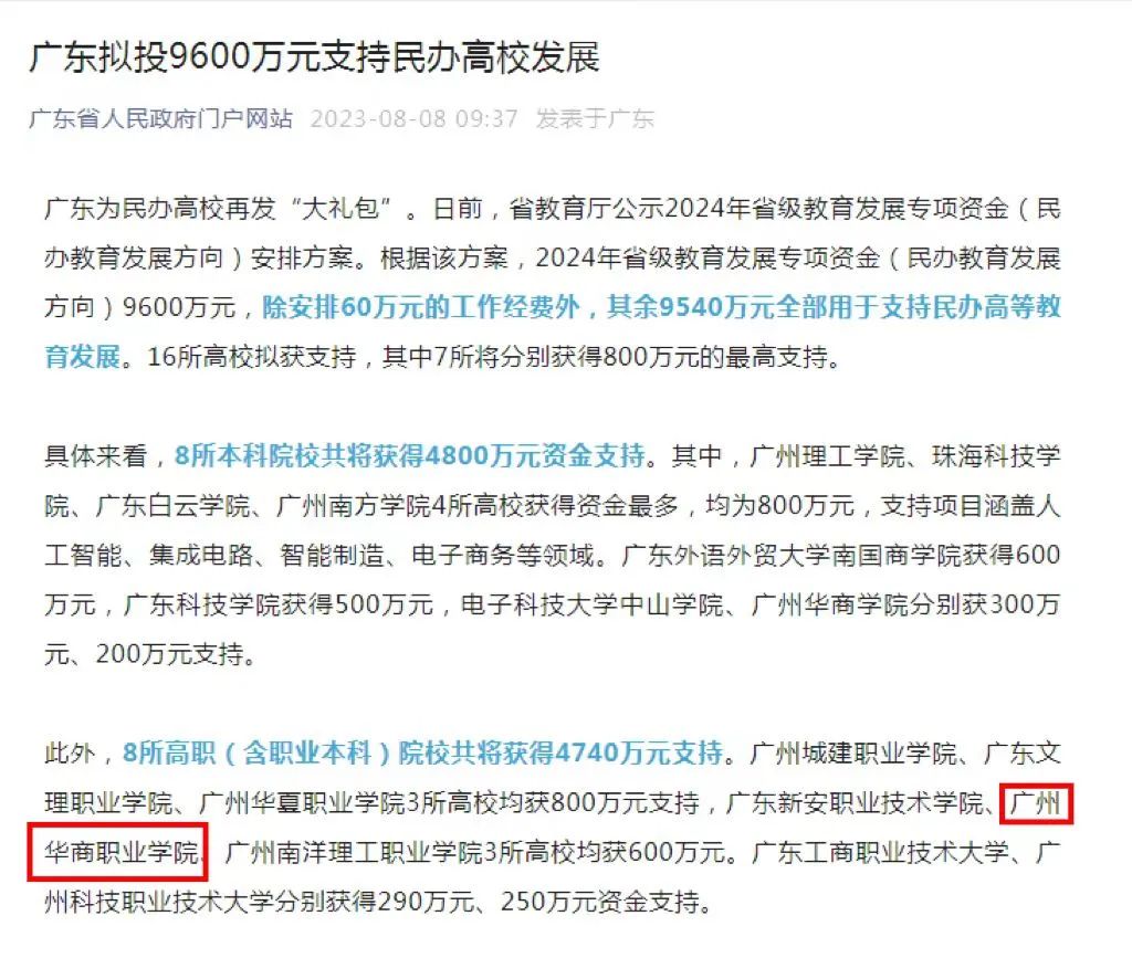 根据广东省人民政府门户网站发布省教育厅公示2024年省级教育发展专项资金(民办教育发展方向)安排,beat365在获得支持的8所高职(含职业本科)院校位列第五,获得资金支持600万,创学校有史以来获专项资金新高。
