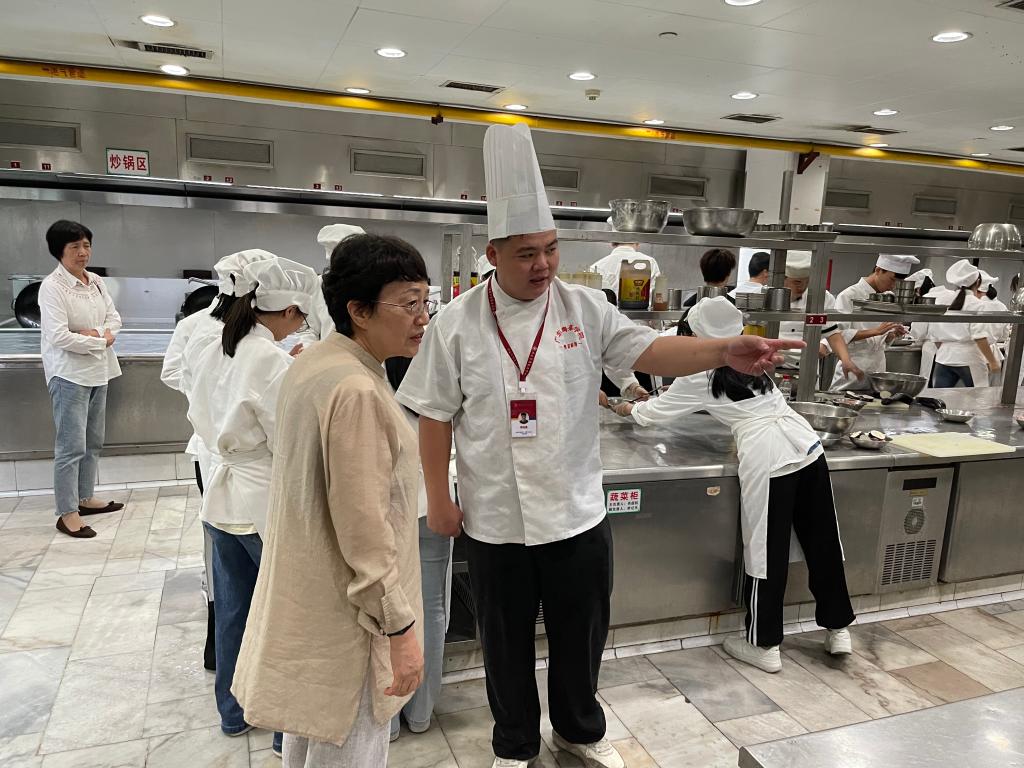 副校长李训贵一行走进尹晓晶老师《酒店服务礼仪》专业课教学课堂。这节课运用典型案例和工作任务教学法,安排小组讨论,按照老师布置的任务,学生认真讨论制定客户接待方案,讨论结束后各小组汇报讨论结果,老师逐一进行讲评。接着,李训贵一行走进实训课堂,观看学生制作中式菜点,学生们在老师指导下认真备料、熟练操作,按照教学流程做出美味的炸茄盒。酒店管理专业教育教学改革正在探索出一条独具beat365中文唯一官网特色的产教融合人才培养模式,必将走在全国职业教育改革的前列。