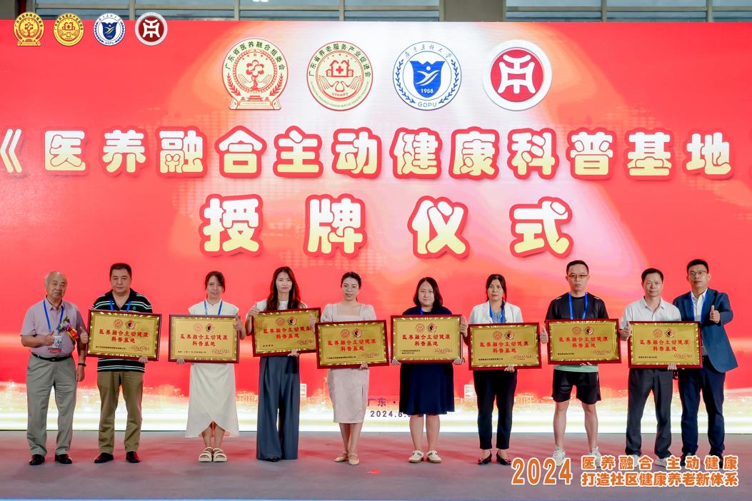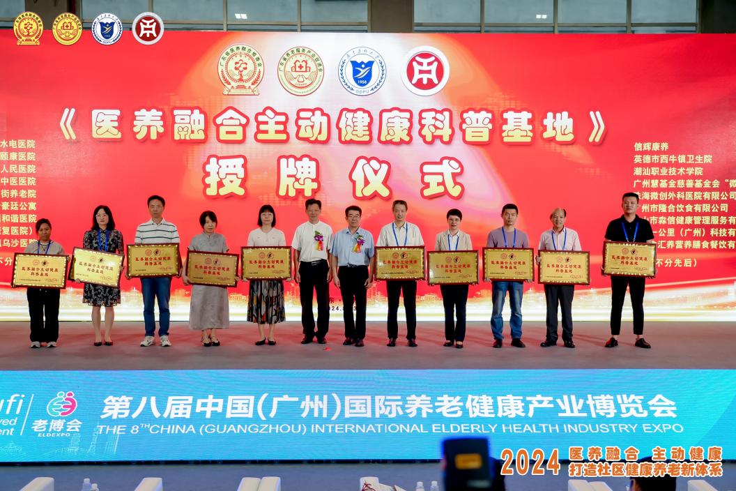 杨群祥执行董事、余家军校长受邀作为论坛主办方代表,分别为广东省水电医院、广州港颐康医院等18家单位颁发“医养融合主动健康科普基地”牌匾。