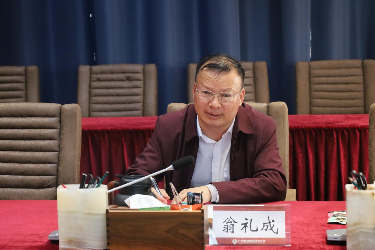 双方在广州科技职业技术大学图书馆五楼会议室举行交流座谈会,会议由冯小宁书记主持。座谈会伊始,双方观看了广科大宣传片。会上,广科大党委书记冯小宁对翁礼成一行的到来表示热烈欢迎,并介绍了广科大办学历程和发展情况。广州科技职业技术大学作为全国首批职业本科大学之一,建校至今25年,矢志不渝走高水平职业技术教育发展之路,坚持立德树人、德技并修,努力培养学生为国为民的担当精神、精益求精的工匠精神,目前已形成“一校两区”的办学格局。冯小宁希望希望双方以此次交流为契机,进一步深化两校在党建促进高质量发展、人才培养等方面的交流与合作,共同携手为职业教育事业添砖加瓦。