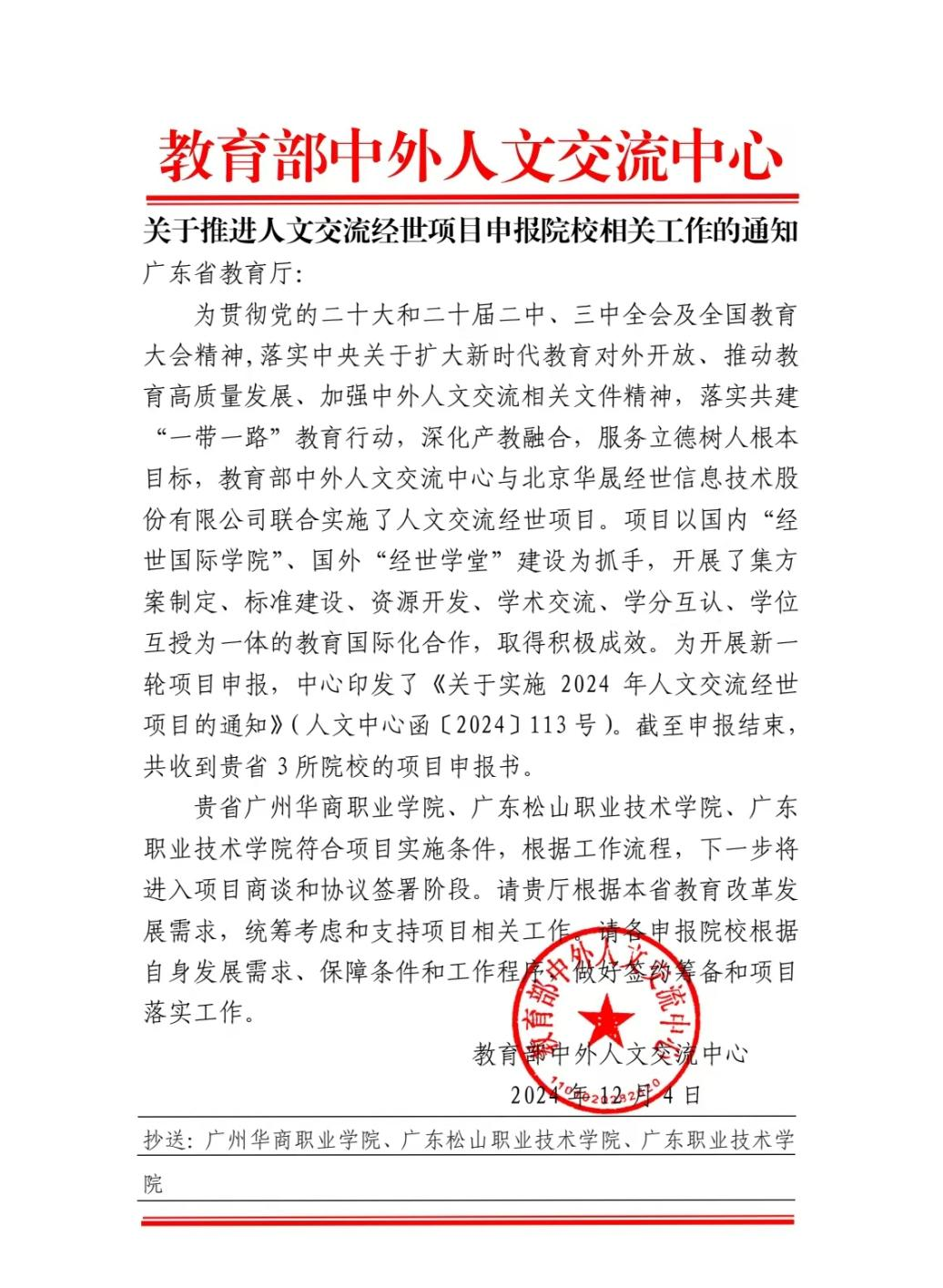 “人文交流经世项目”是教育部中外人文交流中心围绕促进中外人文交流、新技术应用和产教融合,联合国内高校共同实施的国际化教育合作项目。项目以国内“经世国际学院”、国外“经世学堂”建设为抓手,通过“校-校-企”合作模式,开展集方案制定、标准建设、资源开发、学术交流、学分互认、学位互授为一体的全方位教育国际化合作,着重提升国内职业院校和应用技术型大学在学科建设、课程构建、人才培养以及国际合作交流等方面的综合能力,以进一步推进与共建“一带一路”国家院校的深入务实合作。