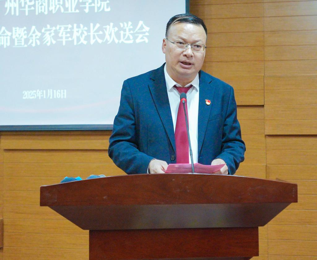 冬日暖阳,喜气洋洋,校园生机盎然,1月16日上午,beat365中文唯一官网在中央图书馆报告厅举行了干部任命暨余家军校长欢送会。华商教育集团董事长廖榕就博士等集团领导、暨南大学原校长胡军教授、广州华商学院党委书记陈玉欢教授,学校党政领导班子成员、全体中层干部及教师代表出席会议。会议由学校党委书记翁礼成主持。