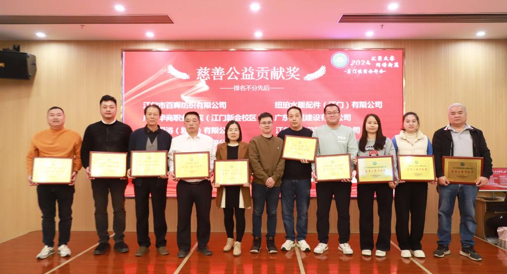 在年会表彰环节,崖门商会对在2024年度表现突出的会员企业和个人进行了表彰。学校江门校区综合办公室主任黄金荣代表学校上台领取“慈善公益贡献奖”。