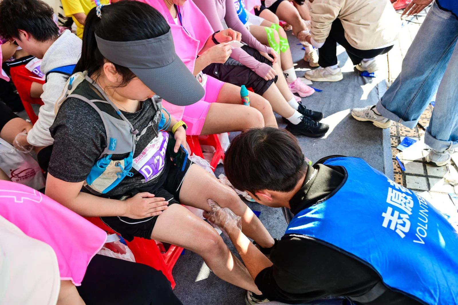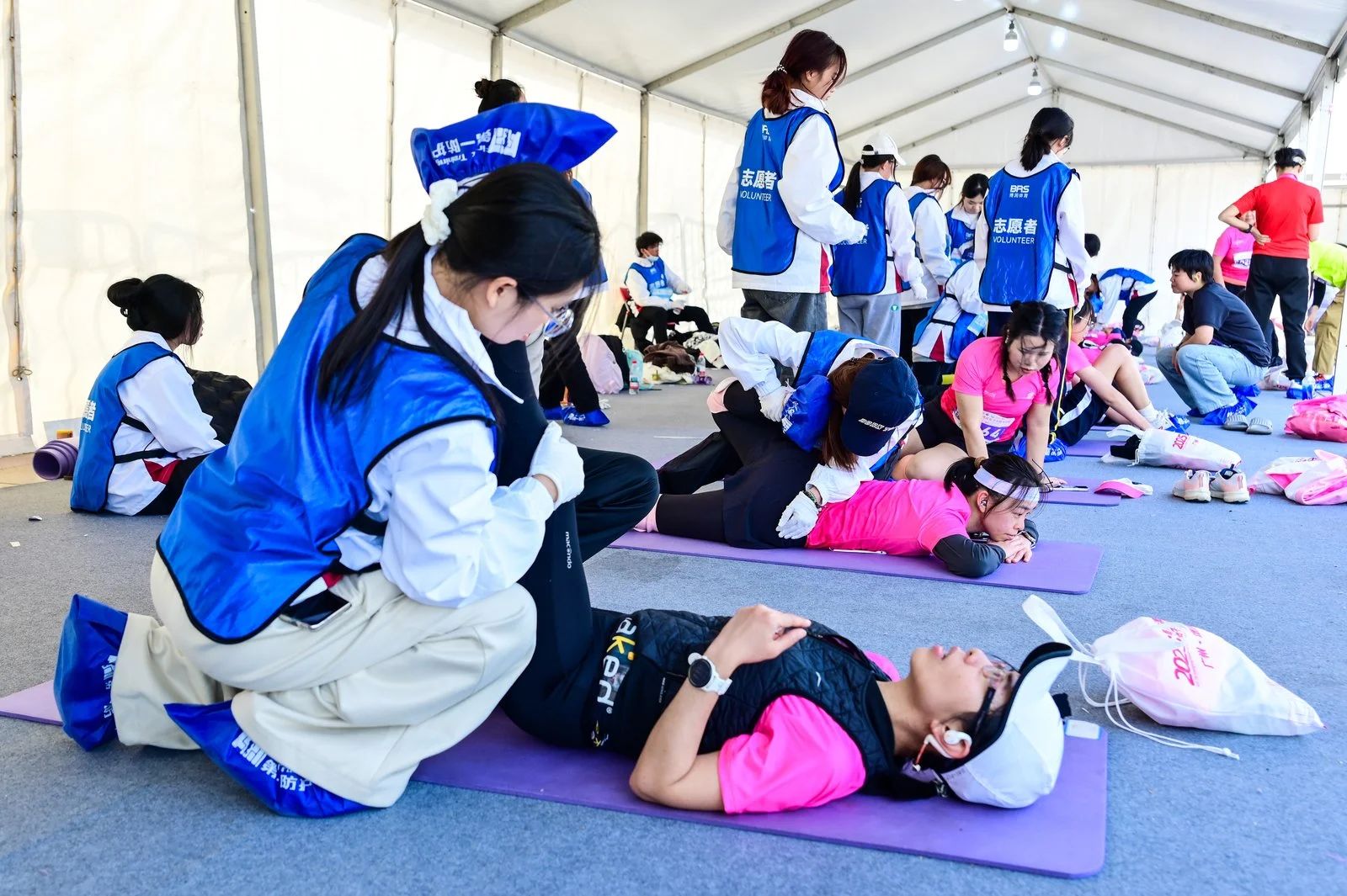 当终点线不再有选手冲过,欢呼与汗水渐渐消散在空气中,医疗志愿者们的另一场战斗才刚刚打响。在赛后拉伸区,为选手们驱散疲惫、助力身体恢复整个拉伸区里,除了志愿者与选手轻声的交流指导,还不时传来选手们舒畅的叹息声,那是身体紧绷后得到释放的信号!