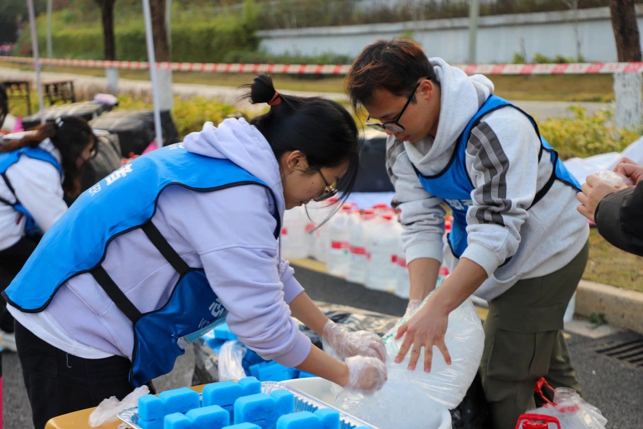 帐篷搭好后志愿者迅速将早已准备好的补给物资搬运进来,按照饮用水、水果、小食品等分类摆放整齐,每个细节都倾注了他们对选手的贴心关怀,只为打造一个个温馨的 “补给港湾”。