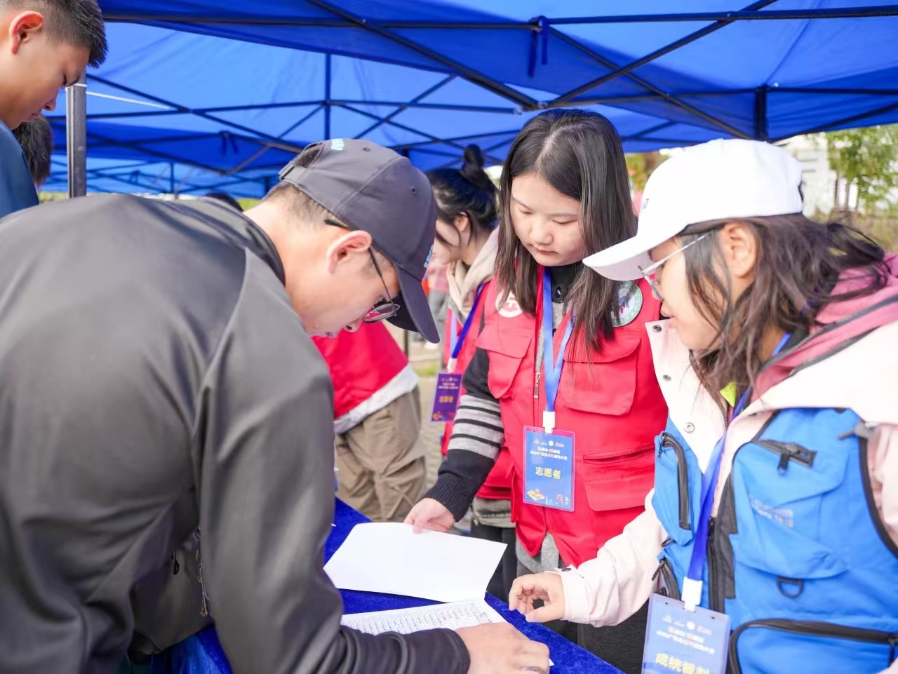在赛事起点,华职志愿者们宛如一群活力满满的精灵,迅速且高效地穿梭于人群之间,忙碌地协助工作人员进行选手的检录工作,他们认真地核对每一位选手的信息,耐心地解答选手们的各种疑问,确保每一位选手都能顺利地踏上比赛征程,有的选手因为紧张而手忙脚乱,他们则用温暖的笑容和鼓励的话语,给予他们安慰,帮助他们放松心情。