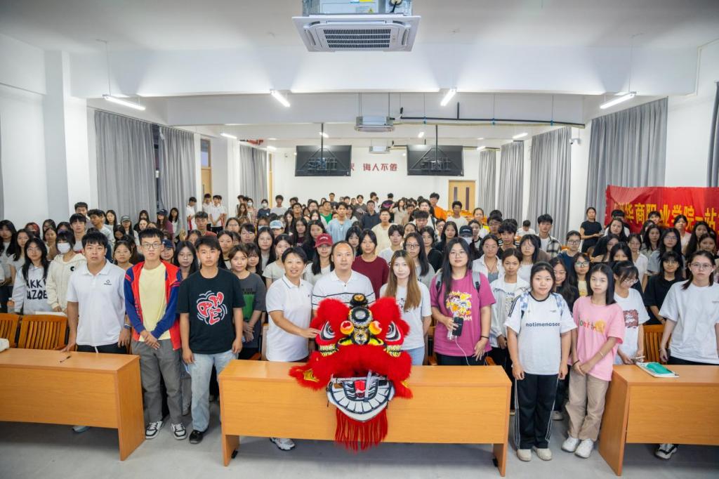 下午5时,讲座在热烈的掌声中拉开帷幕。卢教练作为全国首位民间杂技(舞狮)专业正高级工程师、“广东醒狮”非物质文化遗产代表性传承人,以其深厚的文化底蕴和丰富的实践经验,为同学们详细解读了龙狮文化的丰富内涵与历史渊源。他特别展示了华商职业学院武术协会的南派舞狮狮头,生动地讲述了醒狮与舞龙的历史文化,并对南狮与北狮的特点进行了深入的剖析与现场演示,让在场师生对这一非物质文化遗产有了更为直观的认识。
