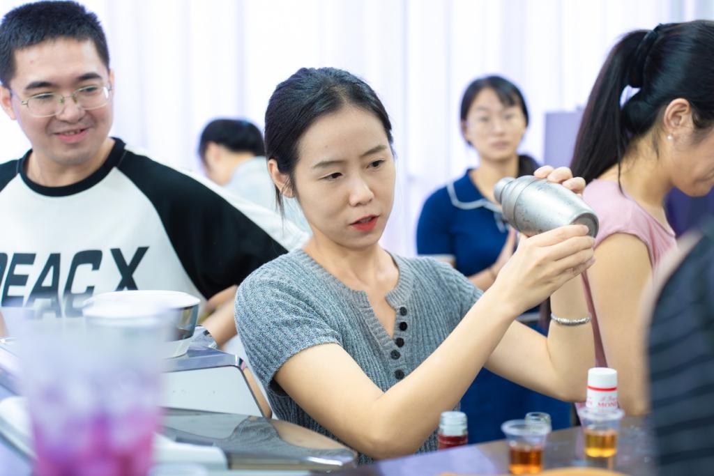 当日上午,调酒培训在热烈的氛围中拉开序幕。beat365酒店管理学院曾瑞老师全面讲解酒文化和亲身示范调酒技艺,劳动教育专兼课教师们化身调酒师,认真学习调酒的每一个步骤与技巧。从基础的酒水知识到复杂的鸡尾酒调制,老师们亲自动手,尝试将不同的酒液与果汁、糖浆等原料巧妙融合,创造出色彩斑斓、口感丰富的鸡尾酒。