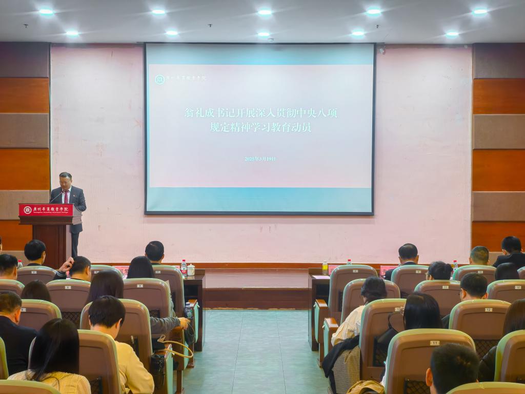 党委书记翁礼成作动员讲话。他指出,开展深入贯彻中央八项规定精神学习教育,是巩固深化主题教育和党纪学习教育成果、纵深推进全面从严治党的重要举措,是密切党群干群关系、巩固党的执政基础的必然要求,是推进中国式现代化的有力保障。全校各级党组织要教育引导党员干部学习领会和贯彻落实中央八项规定及其实施细则精神,进一步锤炼党性、提高思想觉悟,切实为学校高质量发展提供坚强作风保证。