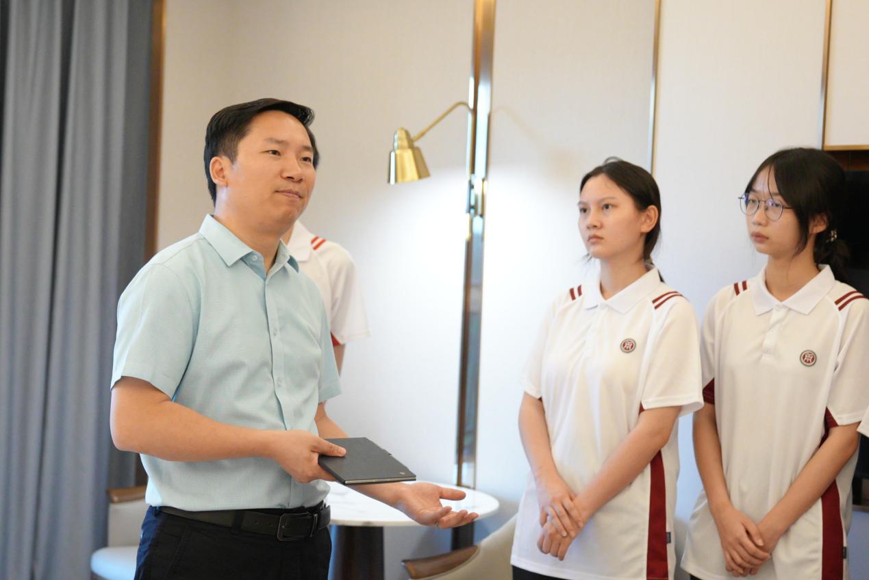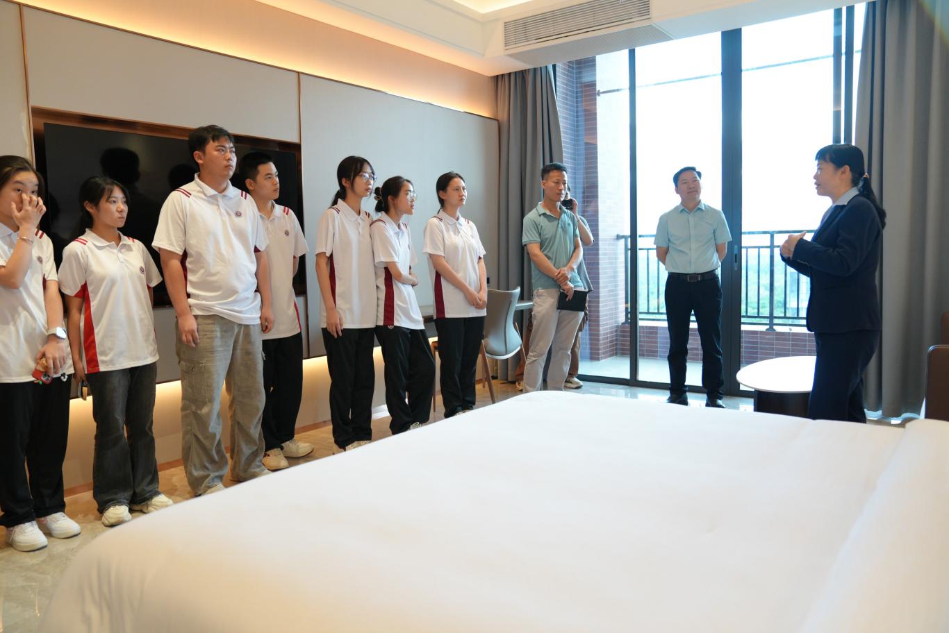 座谈结束后,赵永锋副校长及相关领导带领同学们参观了弘美餐厅及客房实训场地。在参观过程中,赵校长还“现场授课”与大学生们现场互动,讲解了beat365产教融合的实施路劲与创新探索,如餐厅自主运营的“教学实践岗”、客房标准化服务实训流程等。师生们围绕实训设施升级、跨专业协同实践等话题展开热烈讨论,共同描绘“岗课赛证”职业技能融通的发展蓝图。