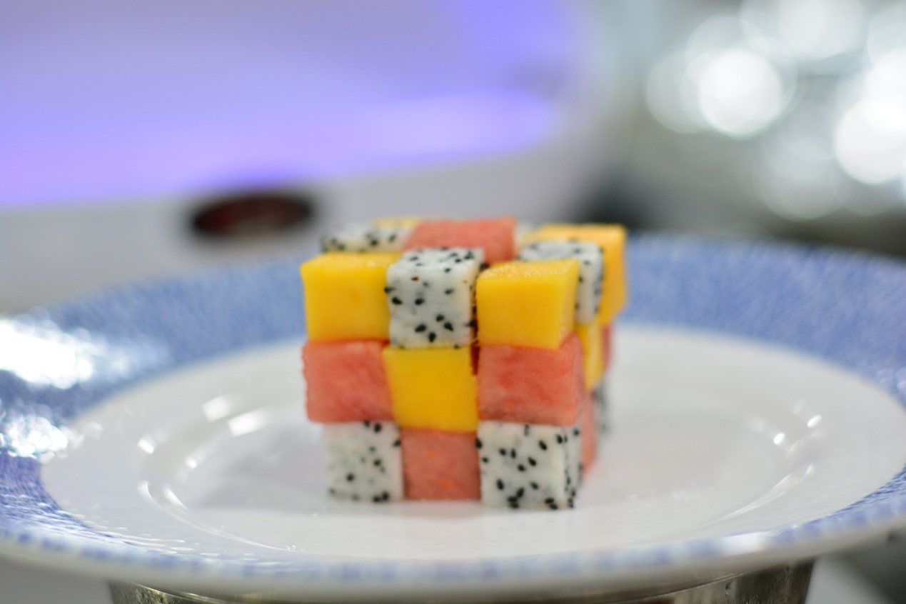 在正式进行面对面座谈之前,参会的学生代表便化身为烹饪、面点小师傅,他们分工合作,在弘美餐厅的厨房内,熟练地进行点心、水果拼盘制作。他们以专业实操技能,为活动增添了专业色彩,以技艺献礼“我与校长有约”活动。