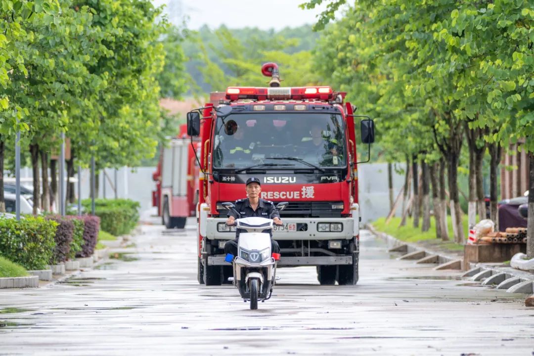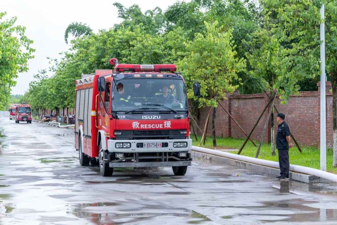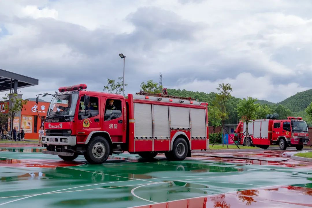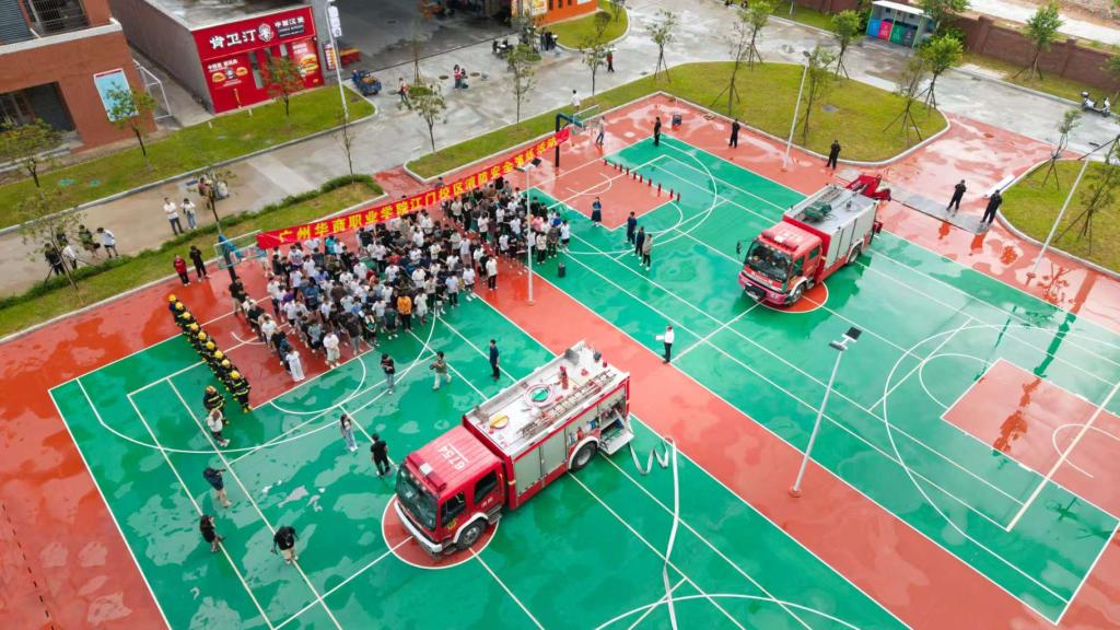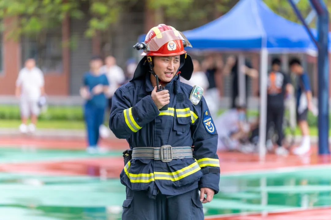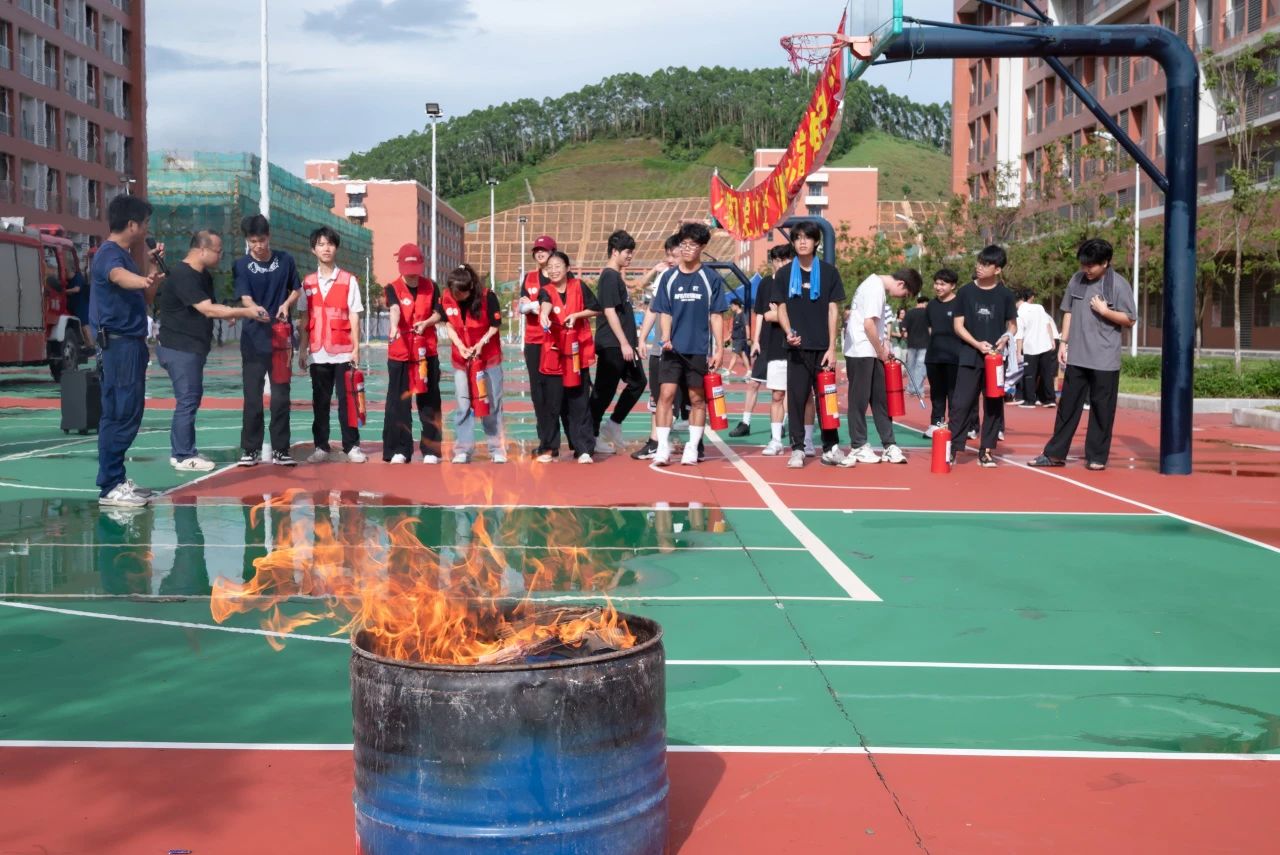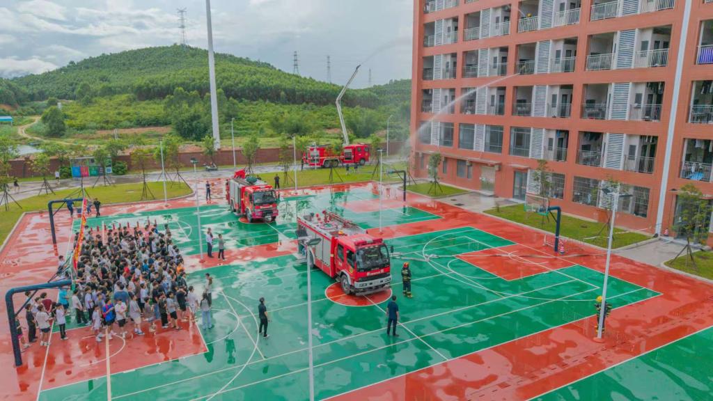 校内消防员、保安迅速建立警戒区隔离危险;校医在预设篮球场集结区待命;消防车抵达校门,保安高效引导并清除路障,确保其快速直达“火场”。