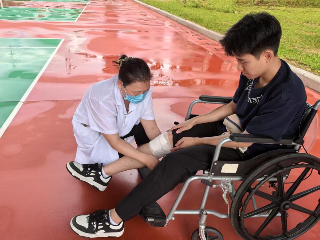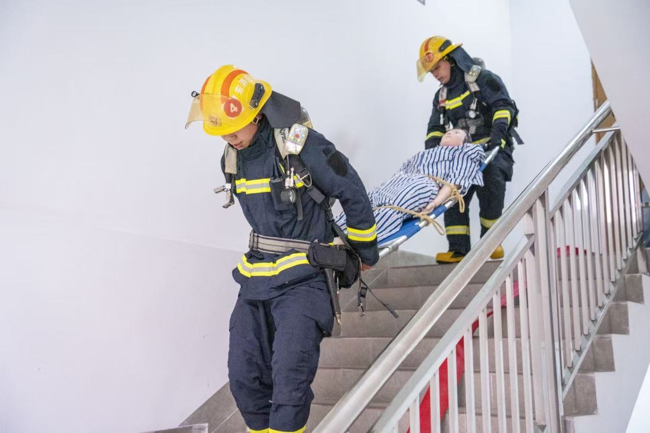演练特别设置突发状况:一名“学生”模拟吸入浓烟晕倒宿舍,消防员迅速冲入,用担架将其抬离至医疗点;另一名“学生”在楼梯间模拟摔伤,由同伴搀扶撤离。校医对“伤员”迅速响应,演示紧急救护流程。