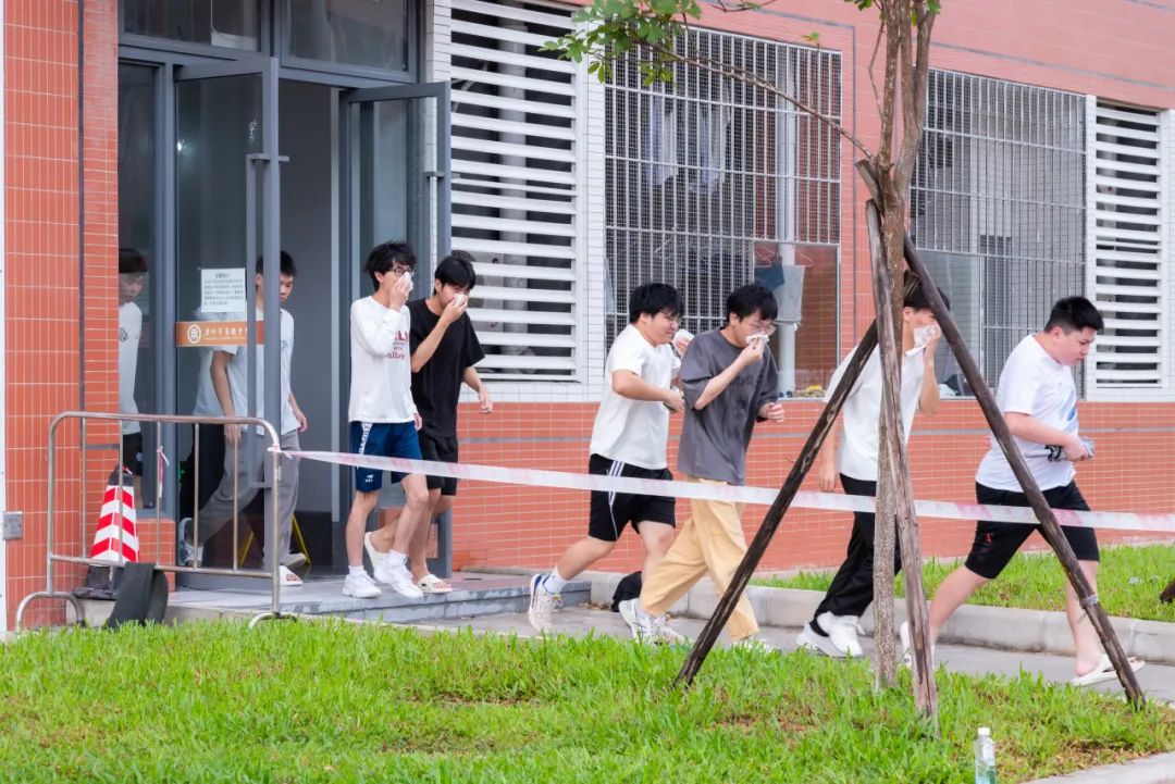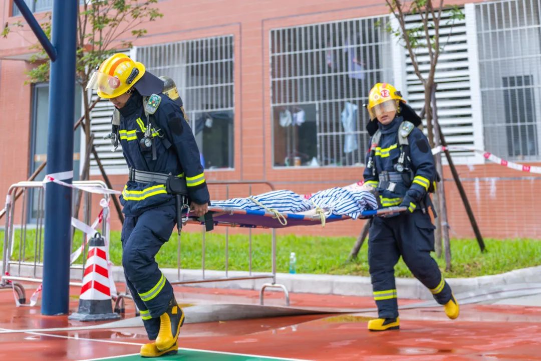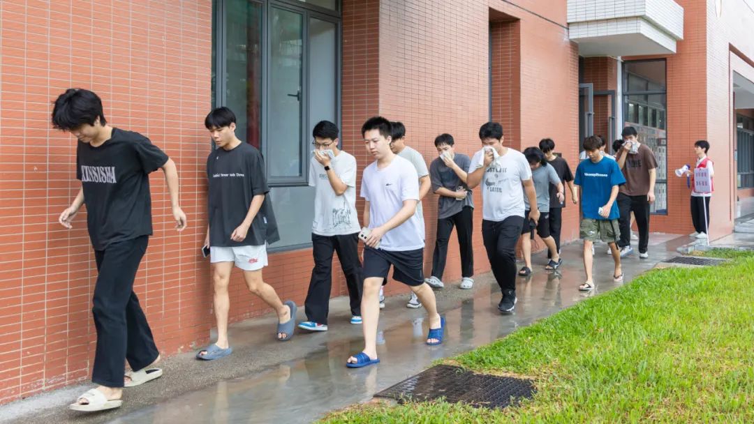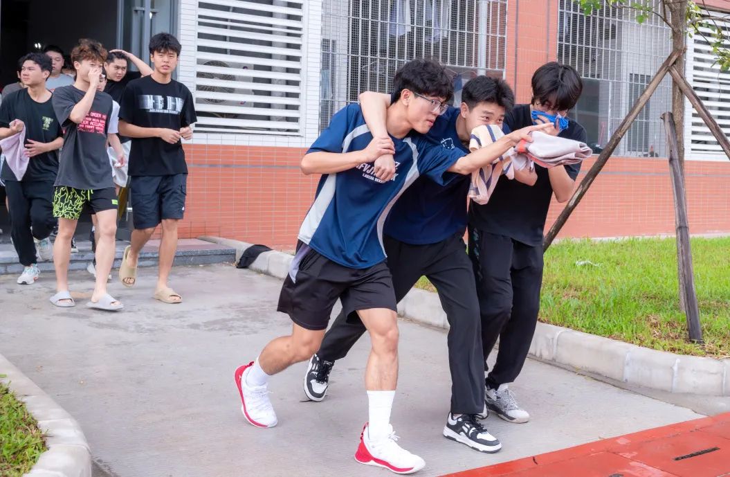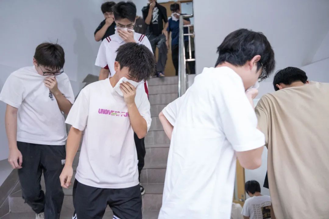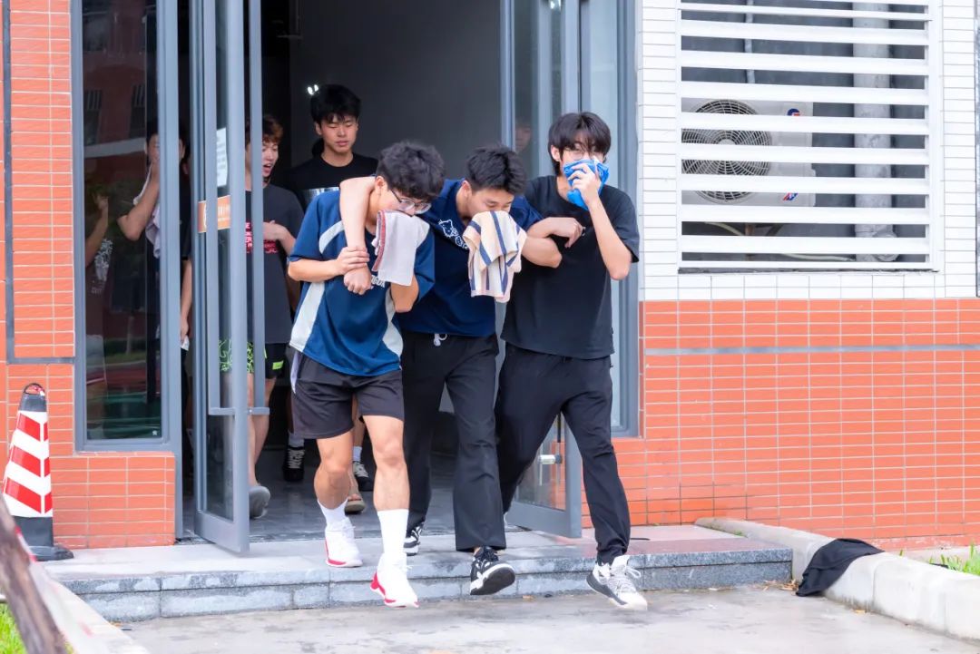 在辅导员、宿管员、宿舍长组织下,参演学生迅速用湿毛巾掩住口鼻,低姿沿预定路线撤离。浓烟中,消防员、保安等坚守关键节点引导,确保学生安全有序撤至14栋南侧篮球场集结区。