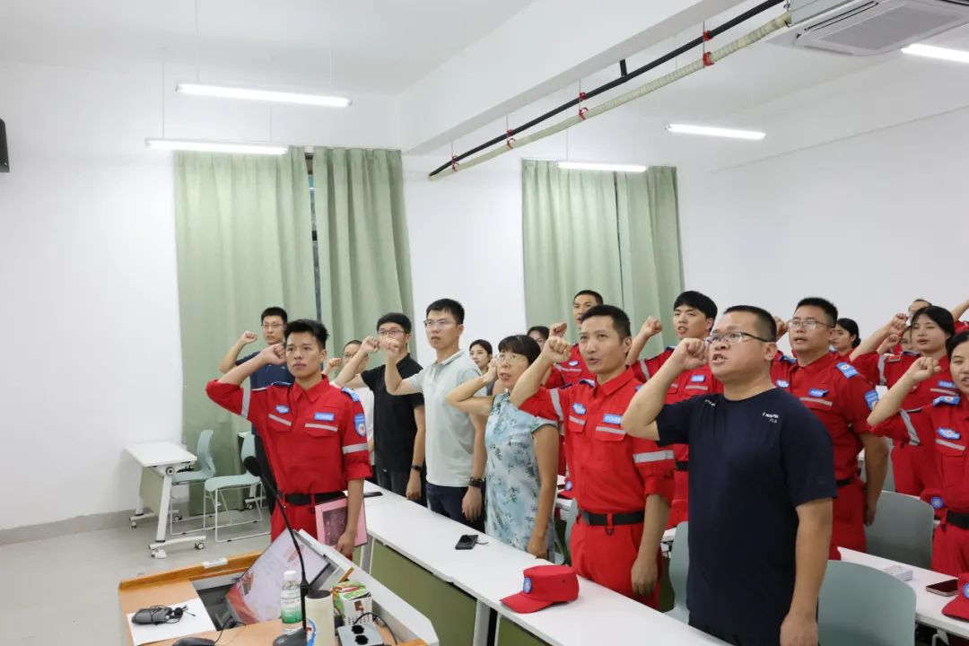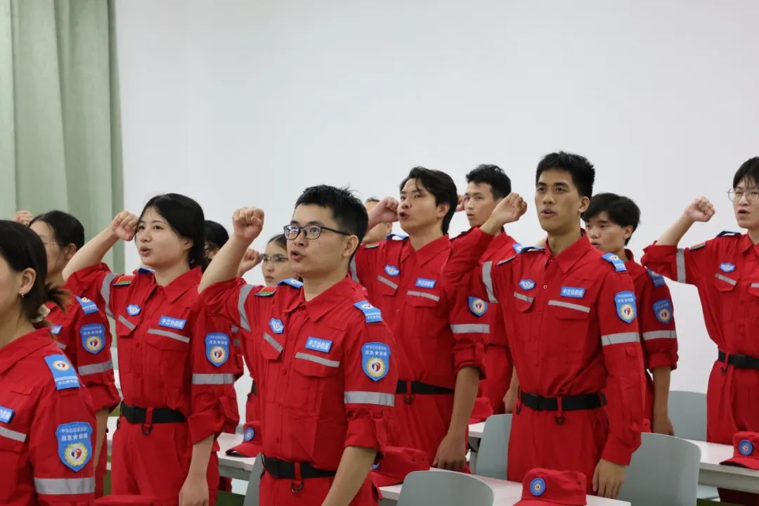 队员代表梁海钊代表全体队员向学校及中华志愿者协会表达谢意,并郑重承诺:将以百分之百的专注夯实急救技能,确保危急时刻“冲得上、顶得住”;以团结协作的精神构筑集体防线,让纪律与温情成为队伍底色;更将主动深入班级开展安全科普,推动“人人懂急救”的校园安全文化建设。紧接着,他带领全体队员进行庄严宣誓,许下守护校园安全的郑重承诺。
