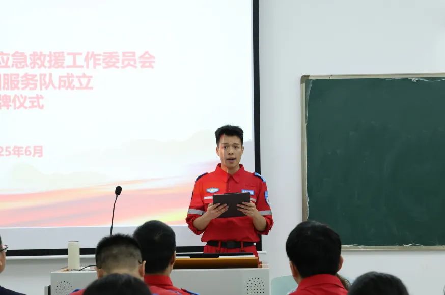 随后,广东直属服务队队长吴良兵致辞,他对服务队的成立给予高度肯定,他强调校园应急救援在保障师生安全、提升校园应急能力中具有重要意义,并鼓励队员们要秉持专业精神,以饱满的热情投入应急救援工作。
