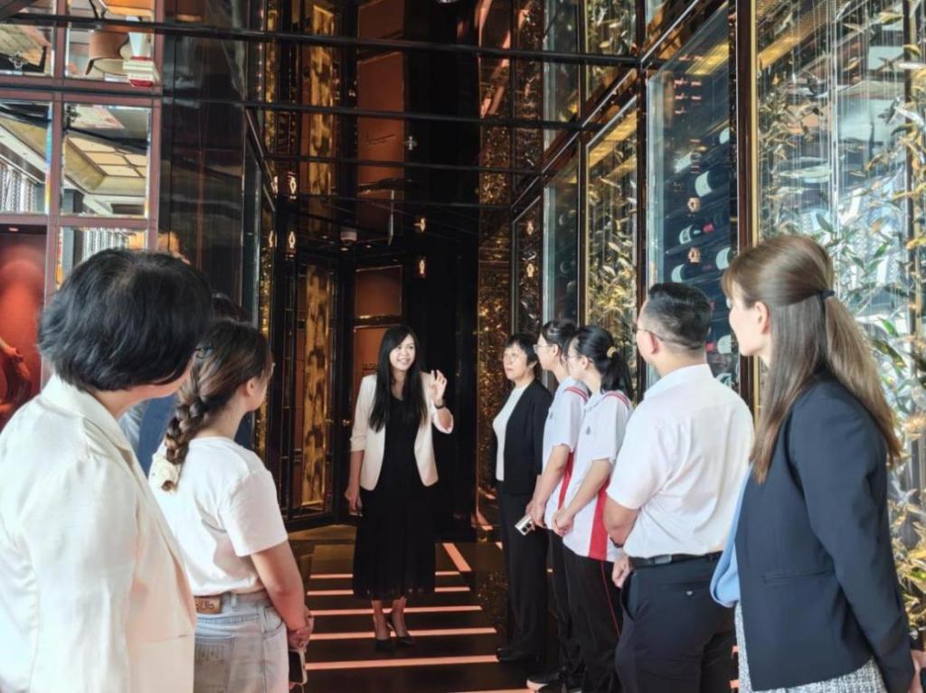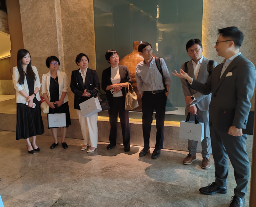 代表团在香港丽思卡尔顿及W酒店学习及发展经理黄咏筠女士、香港瑞吉酒店学习及发展经理陈慧冰女士陪同下,先后参观了香港丽思卡尔顿酒店(The Ritz-Carlton, Hong Kong)、香港W酒店 (W Hong Kong)和香港瑞吉酒店(The St. Regis Hotel Hong Kong)。代表团详细听取了关于三家酒店设计风格、企业文化及服务运营方面的介绍,并调研了香港奢华酒店的前厅接待、客房管理、餐饮服务等核心模块的服务流程与创新实践,重点了解香港酒店业“以客为尊、个性化服务”的服务理念、智能化技术应用及员工培养模式,为后续华商学生适配香港职场打下认知基础。