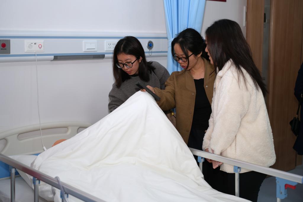 到达健康医学院仿真医院,高度还原的门诊、病房以及护理教学单元十分引人注目。此处对真实的医疗场景进行了复刻,学生能够在此开展全流程、沉浸式的临床学习,达成从理论知识到实践操作、从课堂学习到岗位工作的自然过渡,充分体现了“教学即实战”的职业教育理念。