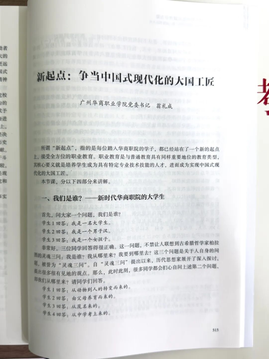 翁礼成书记的思政“第一课”紧扣职业教育特色和时代脉搏,以“新起点:争当中国式现代化的大国工匠”为主题,围绕“我们是谁”“何谓职业教育与大国工匠”“新时代面临的挑战与优势”以及“我们要到哪里去”四个维度展开。课程创新性地将柏拉图“灵魂三问”引入课堂,通过师生互动问答的形式,引导学生深入思考个人身份认同与时代使命。