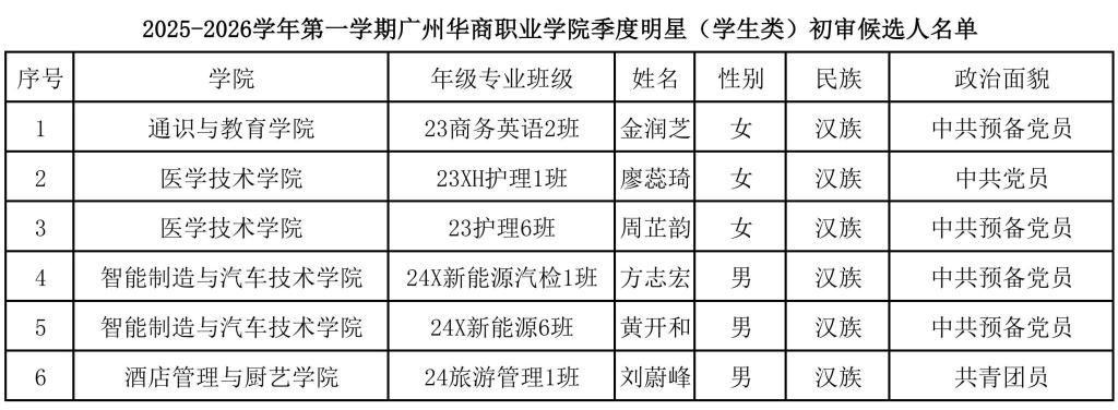 公示时间为2026年1月6日至2026年1月8日,公示期间,如对公示名单有异议者,可在2026年1月8日17:00前以书面形式实名向党委宣传部反映。(联系人:梁杨清,办公地点:弘美楼二楼融媒体中心办公室。)