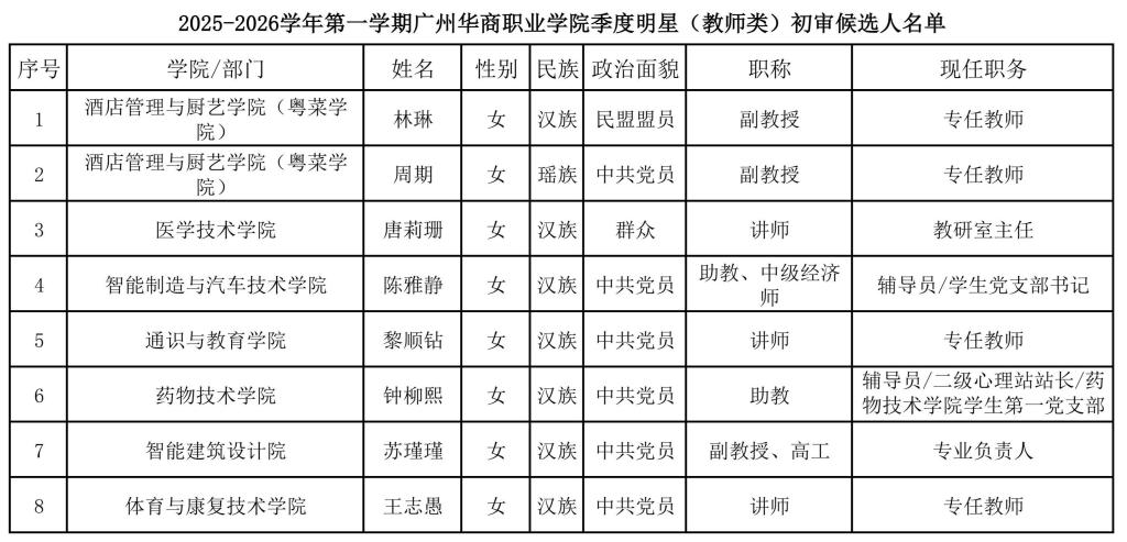 为弘扬榜样力量,激发师生干事创业精神,营造积极向上的校园文化氛围,根据《beat365中文唯一官网季度明星遴选办法(试行)》相关规定,beat365中文唯一官网于近期正式启动2025年度首届“季度明星”评选工作。本次遴选通过个人自荐,经职能部门与二级学院审核、学校评审小组初审,目前已产生14名首届“季度明星”初选入围者。具体名单公示如下:
