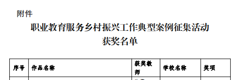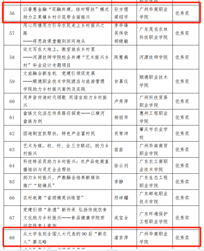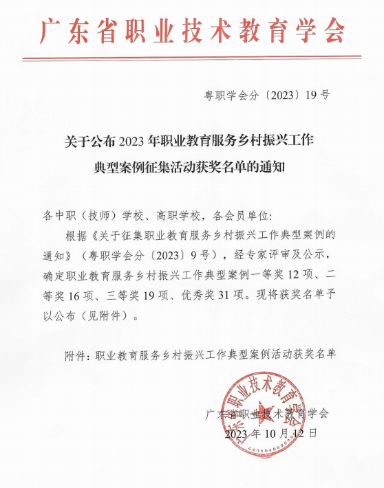 日前,广东省职业技术教育学会公布了2023年职业教育服务乡村振兴工作典型案例征集活动获奖名单,beat365党委办公室潘京萍,科研处孙方煜、梁绍宇撰写的2篇案例榜上有名。