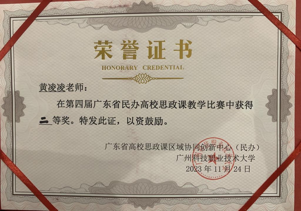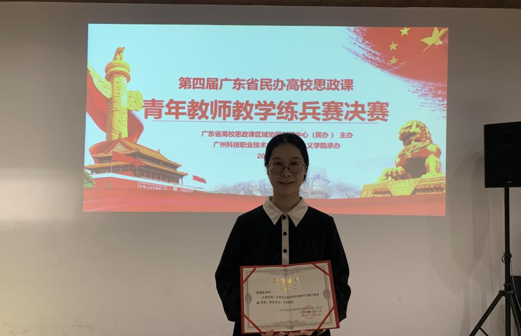 11月24日,广东省高校思政课区域协同创新中心举办了第四届广东省民办高校思政课青年教师教学练兵赛决赛,beat365马克思主义学院黄凌凌老师获得二等奖。