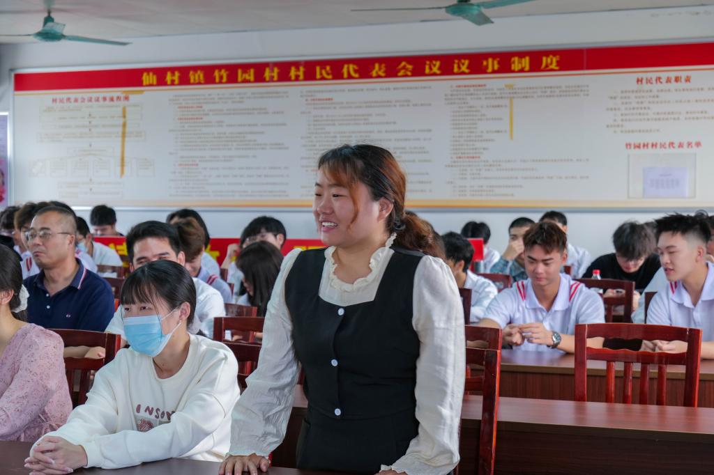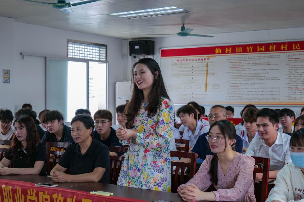 竹园村第一书记姚敏以竹园村特色“四红”:三月红、一点红、木棉红以及红色地标“阮海天故居”为引,向师生们介绍了竹园村的基本情况。通过村党总支“四议一公开”的决策程序,让师生们深刻感受习近平总书记对基层党组织建设的高度重视,以及确保基层事务处理过程中的公开公正性。在互动环节,师生们针对竹园村未来的发展规划、村务法务等问题向姚书记真切请教,姚书记结合本村实际情况,从抓好稳定工作,在保护和培育特色农业的基础上,发展林业和文化旅游业等方面进行了解答。对此,姚敏书记激励大学生要不断提升政治素养,积极向党组织靠拢,珍惜时代与发展机遇,脚踏实地,学好本领,立志报国,为国家发展添砖加瓦。