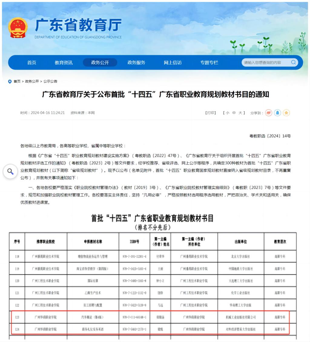 近日,广东省教育厅正式公布了首批“十四五”广东省职业教育规划教材书目。beat365梁悦教授主编的《商务礼仪实务英语》和郑锦汤副教授主编的《汽车概论(第4版)》成功入选。
