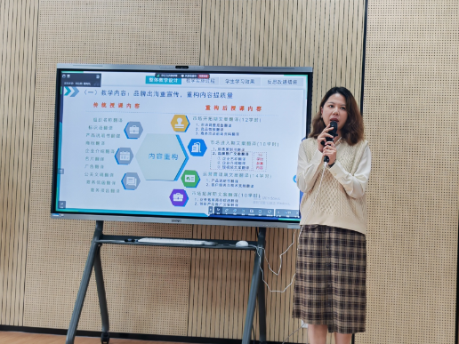随后,6支参赛团队围绕各自的教学主题,展开了精彩纷呈的教学实施报告展示。刘晋团队以高职英语中的职业生涯为主题,巧妙地将职业规划融入语言教学之中;周暖开团队聚焦于高职英语中的品牌教学,深入探讨了品牌意识在英语教学中的核心地位;汤素芹团队以品牌推广文案翻译为主题,生动展示了跨文化交流在商业翻译中的关键作用;杨洁团队以行政法基础知识探索为主题,以通俗易懂的方式传授法律知识;李琴英团队以童谣传承-儿歌传唱为主题,巧妙地将传统文化与现代教学相融合;许嘉琦团队则以聆听童年,探寻教育之秘为主题,深入探讨了教育的深层意义。各团队以其卓越的教学设计和引人入胜的现场演绎,赢得了评委及现场观摩教师的高度评价。
