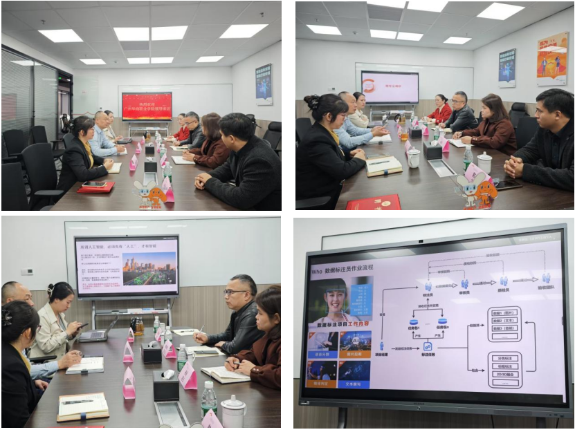在交流座谈会上,数字财经学院与银雁科技聚焦人工智能技术赋能财经教育展开深度研讨。银雁科技总经理柏总详细介绍了人工智能数据标注项目的岗位需求及技术标准,并提出金融大数据处理、AI+营销等领域对复合型人才的需求。杨玲院长表示,学院将加快课程体系改革,通过增设AI技术模块化课程、引入企业真实项目案例等方式,推动教学内容与企业岗位能力要求紧密衔接。双方一致同意以“引企入校”模式共建实训课堂,邀请企业技术骨干参与教学,并联合开发实践课程,助力学生掌握前沿技术应用能力。