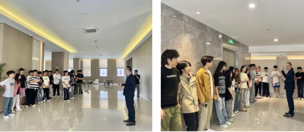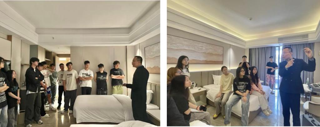 为让学生更直观地感受智能照明技术的实际应用,学院特别申请在校内弘美楼酒店进行实地教学活动。4月16日,钟国强先生及核心设计团队带领学生实地讲解酒店大堂、通道以及客房灯光设计的应用场景,分析灯光设计对空间氛围、功能性和用户体验的影响。