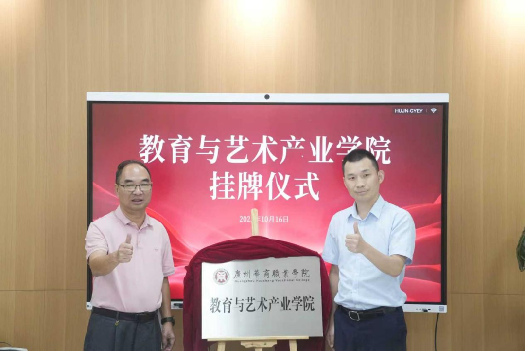 在全体与会代表见证下,徐文龙副总经理与杨伟传院长共同为“教育与艺术产业学院”揭牌。