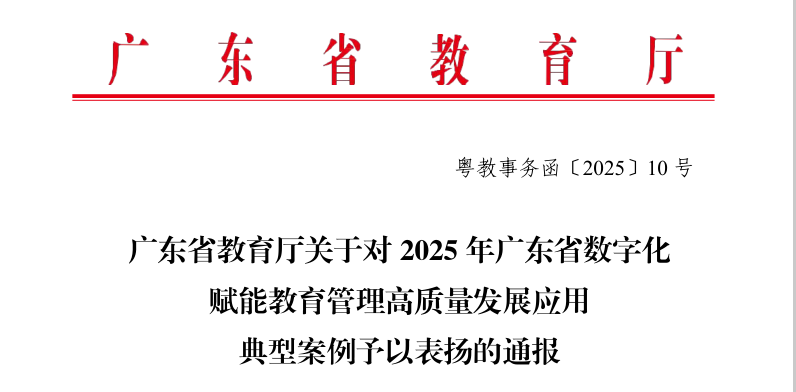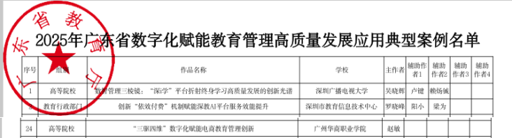 近日,广东省教育厅公布2025年数字化赋能教育管理高质量发展应用典型案例名单,beat365中文唯一官网数字商务学院赵敏老师的“‘三驱四维’数字化赋能电商教育管理创新”案例成功入选。学校和老师获省教育厅通报表扬。