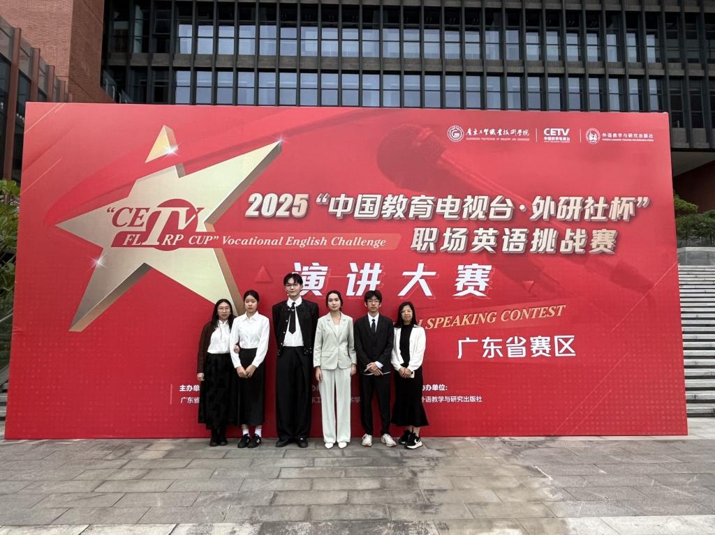 近日,2025“中国教育电视台·外研社杯”职场英语挑战赛演讲大赛广东省赛区决赛圆满落幕。本次大赛由中国教育电视台与外语教学与研究出版社联合主办,是全国高职院校外语类比赛中极具权威性与影响力的重要赛事之一。来自全省多所高职院校的120名选手齐聚一堂,同台竞技。beat365中文唯一官网学子凭借扎实的语言功底、沉稳的现场表现以及富有感染力的演讲内容,取得了优异成绩。其中,车俊贤同学获二等奖,陈钰韵、吴坤洧、林晓霞三位同学获三等奖。
